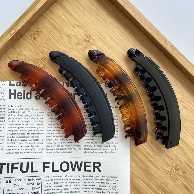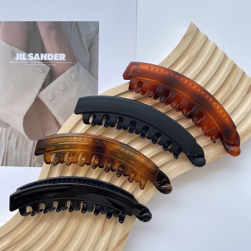 このバナナクリップは、動物柄やヒョウ柄のデザインが特徴的で、華やかな印象を与えます。軽量でありながら、縦型のカーブ形状が髪をしっかりとホールドします。大きめのサイズで使いやすく、光沢のある仕上げがスタイリッシュなアクセントになります。