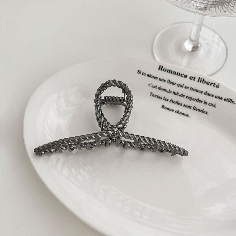 このバンスクリップは、ねじれを取り入れたデザインが特徴で、光沢のあるメタル素材が高級感を引き立てます。しっかりとしたジッケピンで髪をしっかり固定し、ミディアムサイズで使いやすいです。ねじりデザインがシンプルながらも印象的で、さりげないおしゃれを演出します。