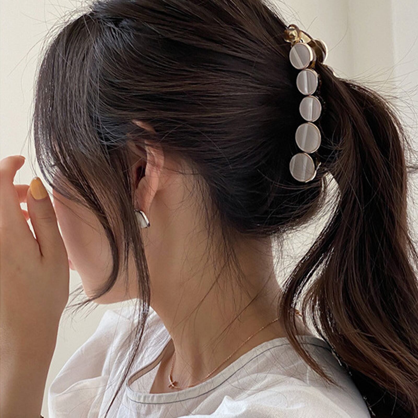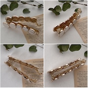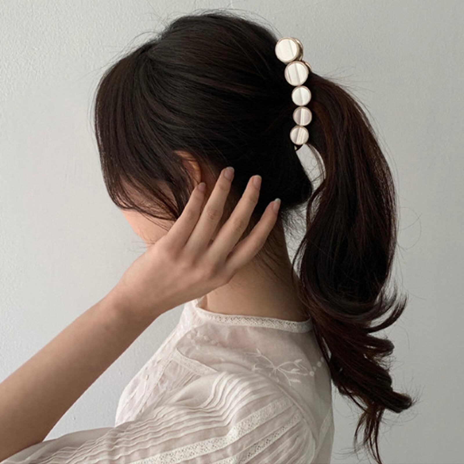 このバナナクリップは、光沢感のある大理石風デザインが魅力のLサイズヘアアクセサリーです。軽量なポリスチレン樹脂素材と縦型カーブ設計で、しっかりと髪をホールドし、ポニーテールやハーフアップなどのアレンジが簡単に決まります。上品でエレガントなデザインは、普段使いはもちろん、特別なシーンにもぴったりです。