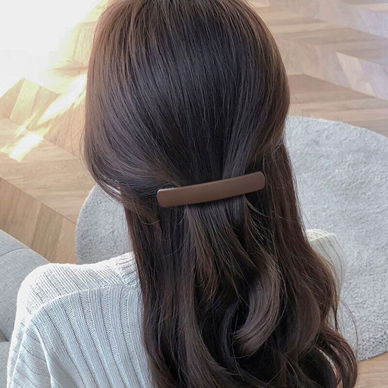 このバレッタは、軽量なプラスチック樹脂で作られたシンプルなデザインのヘアクリップです。くすみカラーのマット仕上げで、細長いスクエア形状が特徴のミディアムサイズです。カーブしたアーチ形状により髪にしっかりフィットし、日常使いに最適です。