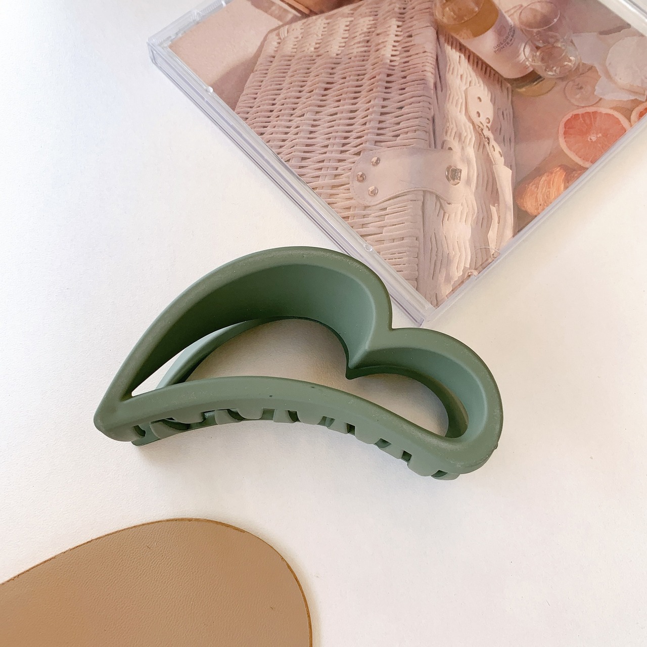 このバンスクリップは、軽量で扱いやすいプラスチック製のヘアクリップです。シンプルで無地なデザインに、くすみカラーのマット仕上げが特徴で、ハート型のくり抜きがアクセントになっています。中くらいのミディアムサイズで、髪をしっかりとまとめることができるシンプルでスタイリッシュなアイテムです。