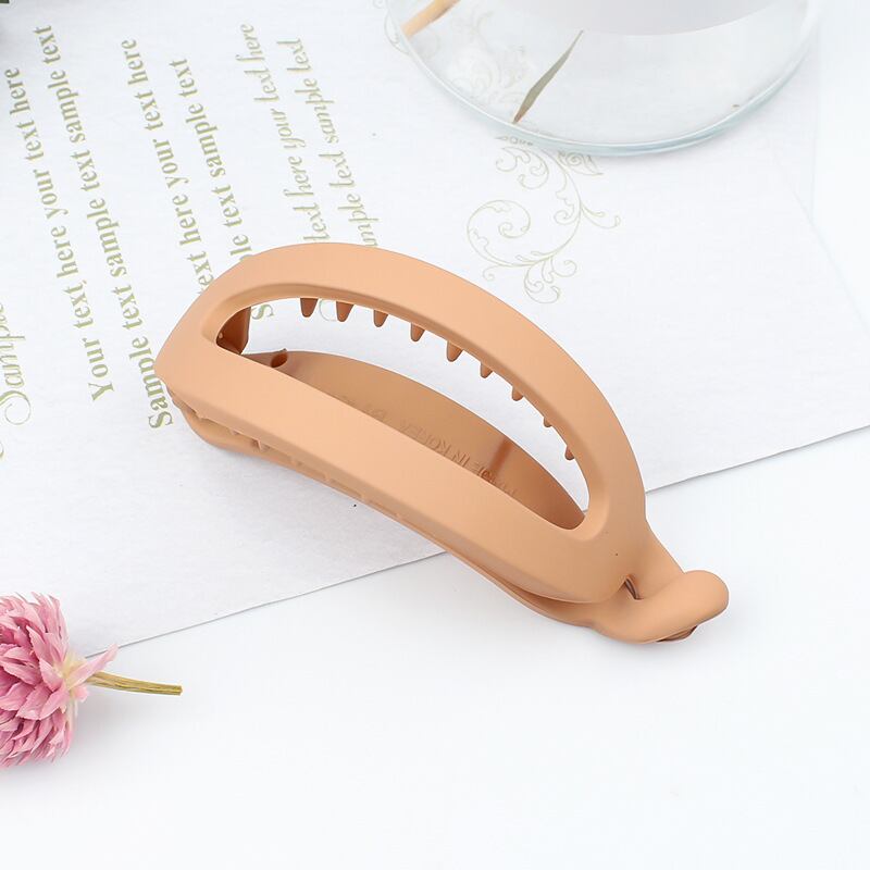 このアーチ型のバナナクリップは、シンプルでありながら高級感のあるデザインが特徴です。プラスチック製で軽量、くすみカラーのマットな仕上げが落ち着いた印象を与えます。小さめサイズで、中抜きの透かしデザインが髪に自然なカーブを作り、華やかさを引き立てます。